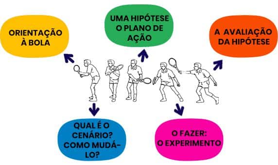 (B) Qual é o cenário? Como mudá-lo? o praticante interpreta a situação, forma um cenário em que imagina diferentes situações desde como virá a bola, até as consequências dele rebater de um jeito ou outro.