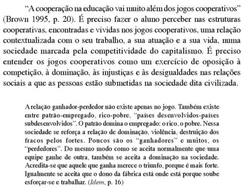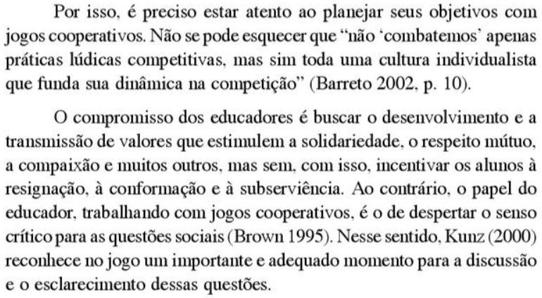 Assim, podemos perceber através do presente estudo, que a Educação Física vem sendo reconhecida por seu papel de socialização e de uma educação para valores, porém ainda não conseguiu se desvencilhar totalmente de uma visão voltada para o rendimento, competição e formação de atletas. Correia (2006) destaca que os jogos cooperativos podem ser uma proposta coerente para as perspectivas de mudança ou de superação do “mito da competição” que a Educação Física escolar vem buscando. Em resultados encontrados em seus estudos, em uma experiência com alunos do ensino fundamental em uma escola pública da rede estadual do Rio de Janeiro, mostra que nem sempre as atividades com jogos cooperativos são prontamente aceitas, mas admite que estas despertam questões sociais quando “confrontados” com a realidade da cultura competitiva trazida pelos alunos. Esses conflitos são vistos como oportunidades para questionar com os alunos o paradigma da competição e pensar com eles a perspectiva da cooperação em suas relações cotidianas. Assim, como afirma Brotto (1997), com a utilização dos jogos cooperativos, expressamos livremente a solidariedade que existe dentro de nós e compartilhamos qualidades – habilidades humanas essenciais como respeito mútuo, confiança, comunicação e comunhão dos objetivos. O que através das respostas pode ser expresso em cooperação, respeito, companheirismo, união, paz, amor, espírito de equipe, compreensão, amizade e bondade.