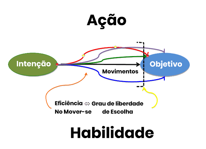 Pode-se chegar ao objetivo por meio de vários movimentos diferentes (representadas pelos riscos em azul, preto, vermelho e roxo). Por exemplo, na atividade proposta os participantes realizaram vários movimentos diferentes para cumprir os objetivos. A qualidade com que se alcançam os objetivos por meio dos movimentos é referente à habilidade que se tem para realiza-los.